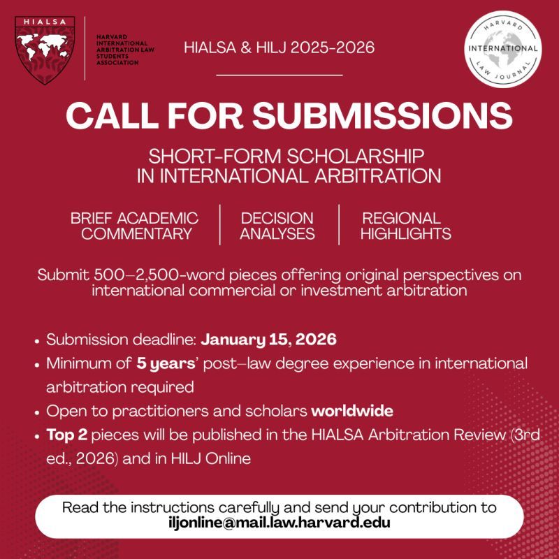 The Harvard International Arbitration Law Students Association (HIALSA) and the Harvard International Law Journal (HILJ) have jointly announced their 2025–2026 Call for Submissions for short-form academic writing in international arbitration. This highly anticipated initiative aims to promote rigorous, insightful, and globally relevant scholarship in the fields of international commercial and investment arbitration.