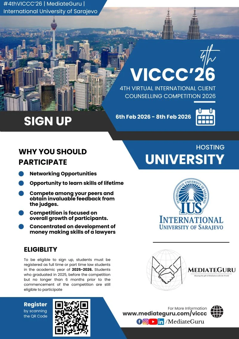 The 4th Virtual International Client Counselling Competition (VICCC) 2026, organised by MediateGuru in collaboration with the International University of Sarajevo, invites law students from across the globe to participate in this prestigious international event. VICCC is specially curated to strengthen practical lawyering skills, with a strong emphasis on client counselling and preventive law.