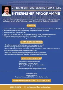 The Office of Shri Dhairyashil Mohan Patil, Hon’ble Member of Parliament (Rajya Sabha) is inviting applications for a prestigious In-Office Parliamentary Research Internship during the Budget Session 2026. This internship is a unique opportunity for students who wish to gain hands-on exposure to India’s parliamentary ecosystem, public policy formulation, and legislative research.