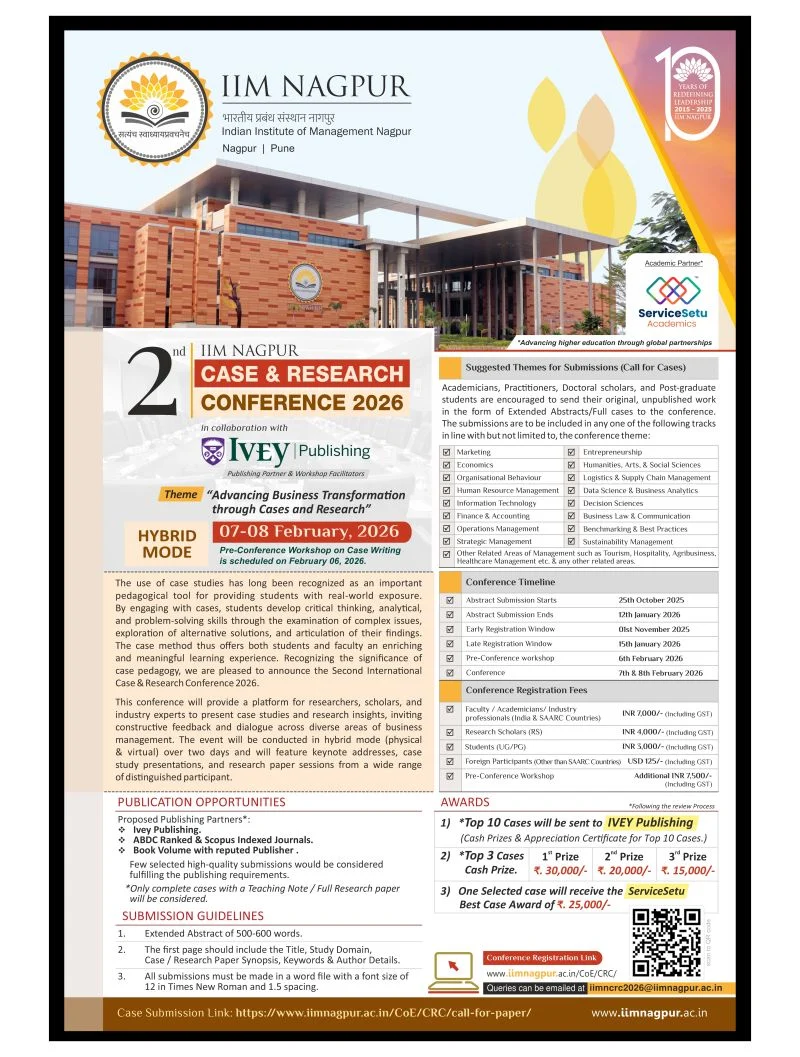 The 2nd IIM Nagpur Case & Research Conference 2026: Theme: Advancing Business Transformation through Cases and Research is an international academic event dedicated to strengthening the role of case-based learning and applied research in management education. The conference aims to bring together academicians, industry experts, researchers, and practitioners to exchange innovative ideas, real-world cases, and impactful research that can drive business transformation.