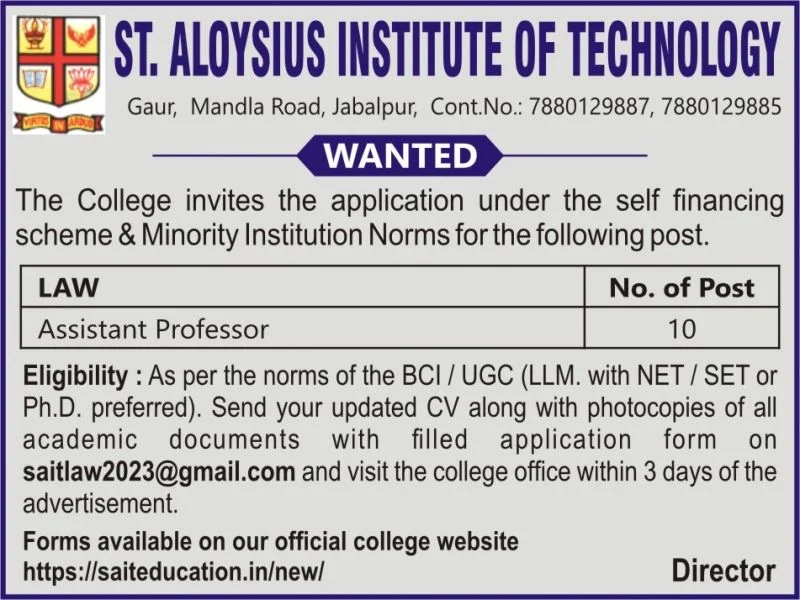 St. Aloysius Institute of Technology (SAIT) Department of Law, Jabalpur, has announced a recruitment 2026 drive for the post of Assistant Professor of Law. Eligible and enthusiastic candidates with a strong academic background in law are invited to apply immediately.