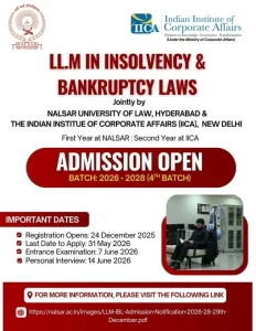 NALSAR University of Law, Hyderabad in collaboration with the Indian Institute of Corporate Affairs (IICA), New Delhi, has announced admissions for the 4th Batch (2026–2028) of its prestigious 2-Year LL.M. in Insolvency & Bankruptcy Laws (IBL).