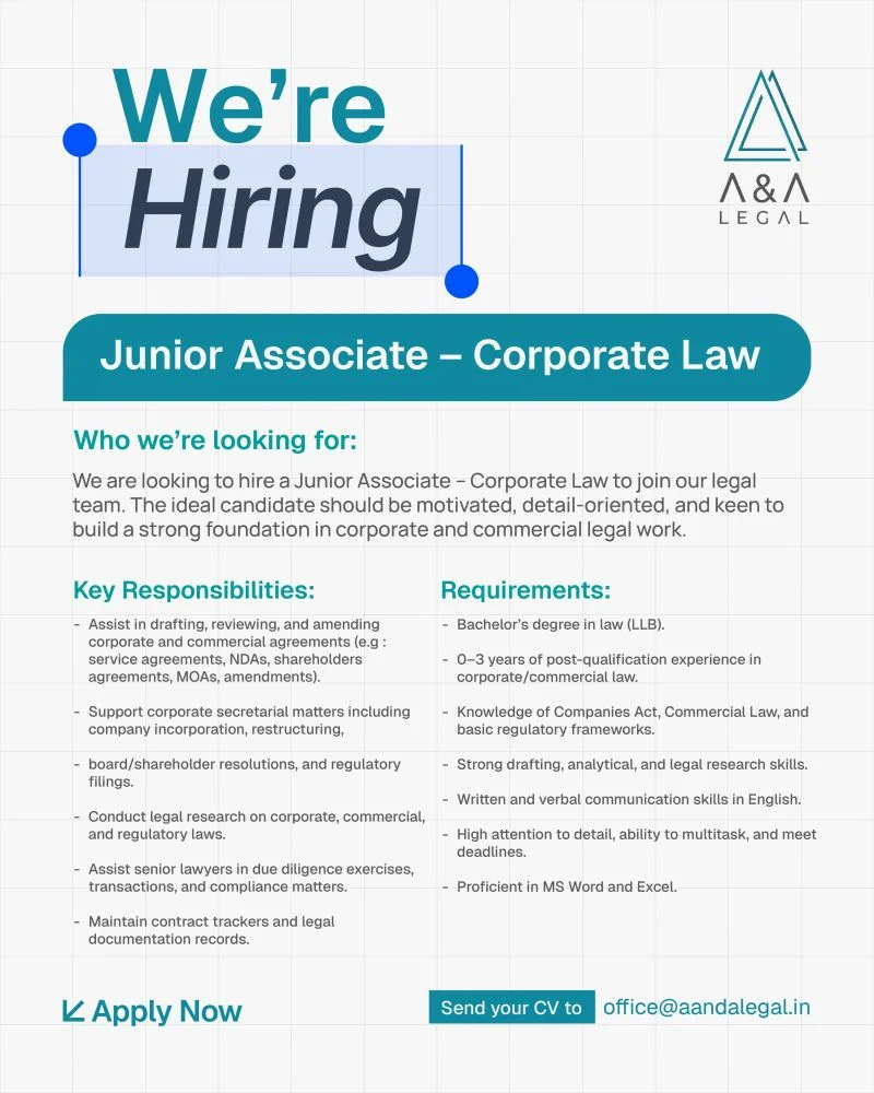 A&A Legal has announced an exciting career opportunity for a Junior Associate – Corporate Law, inviting young and motivated law graduates to join its growing corporate legal team. This role is ideal for candidates who wish to build a strong foundation in corporate and commercial legal practice while working closely with experienced professionals.