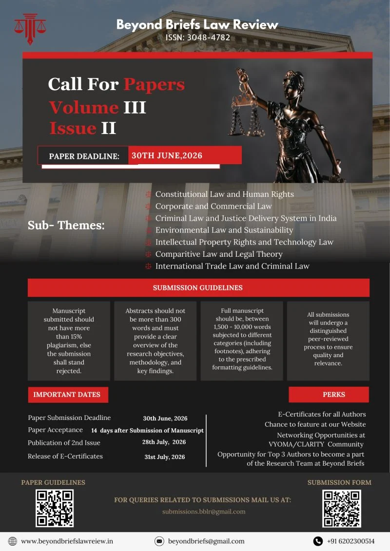 Beyond Briefs Law Review (BBLR) is pleased to announce a Call for Papers for Volume III | Issue II. Scholars, academicians, researchers, legal practitioners, and students are invited to submit original and unpublished research manuscripts for publication in this peer-reviewed legal journal.