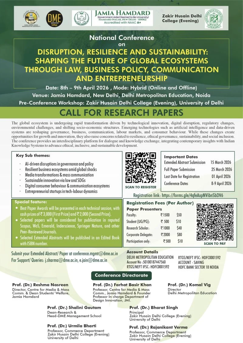 Jamia Hamdard (New Delhi), in collaboration with Delhi Metropolitan Education (Noida) and Zakir Husain Delhi College (Evening), University of Delhi, is organising a National Conference 2026 on: