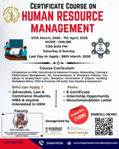 Legal Research & Analysis (LRA) presents a Certificate Course on Human Resource Management (HRM), a comprehensive 4-week online programme 2026 designed for MBA/Law, Etc, to provide participants with practical HR skills, labour law knowledge, and workplace compliance expertise.