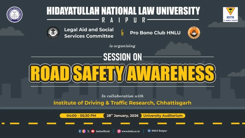 Hidayatullah National Law University (HNLU), Naya Raipur, reaffirmed its commitment to social responsibility by organizing a Road Safety Awareness Session on 28 January 2026 in collaboration with the Institute of Driving and Traffic Research, Chhattisgarh (IDTR-CG). The session was held as part of National Road Safety Month (1–31 January), observed under the Ministry of Road Transport and Highways, Government of India.