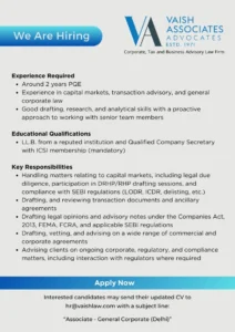 Vaish Associates Advocates, a leading corporate, tax, and business advisory law firm established in 1971, has invited applications for the position of Associate – General Corporate at its Delhi office. This opportunity is ideal for young legal professionals looking to build a strong career in capital markets, corporate advisory, and regulatory compliance.