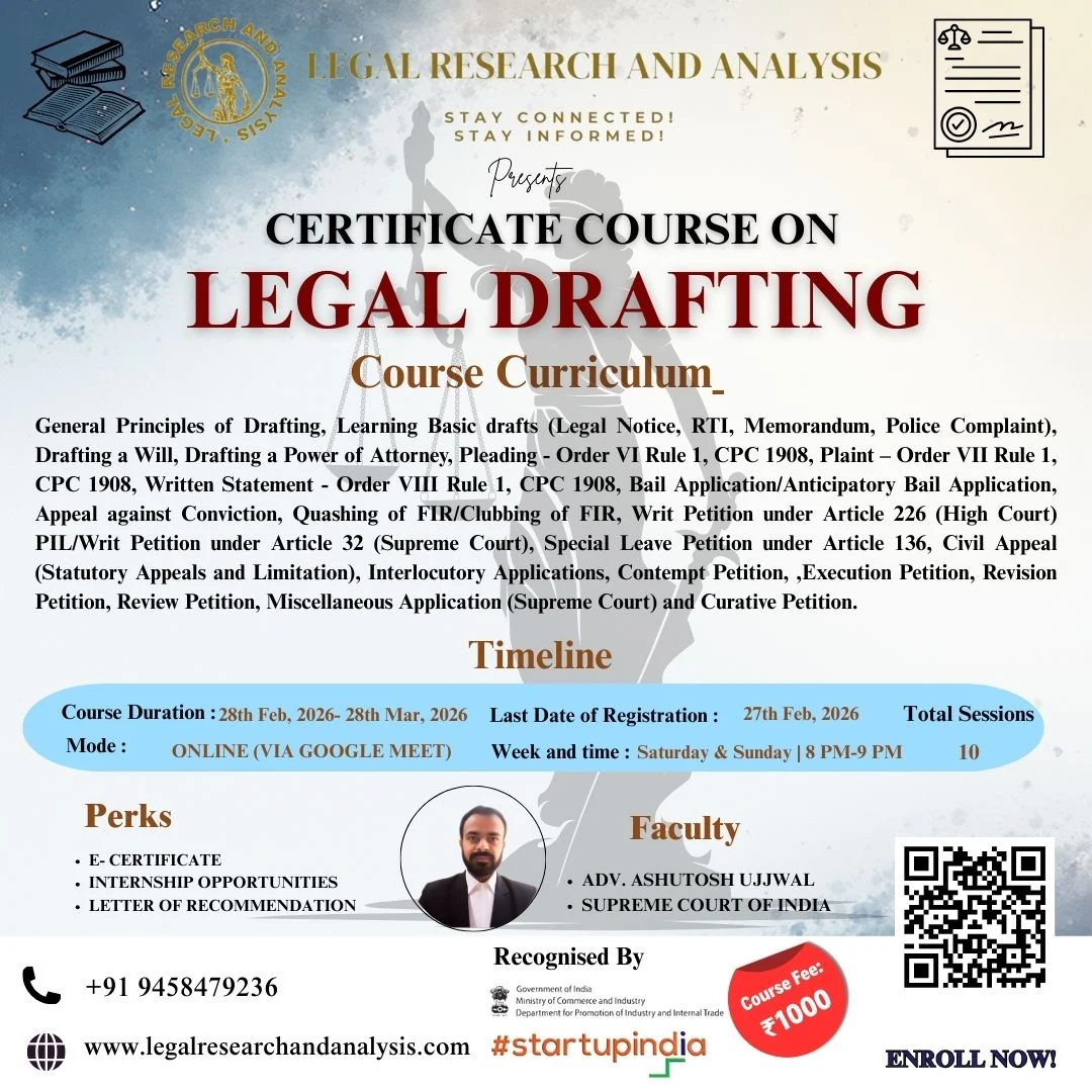 This online Advanced Legal Drafting course 2026, offered by Legal Research and Analysis (LRA), covers Conveyancing, Contract Drafting, Criminal, Civil, and Corporate Law, among others. It helps law students, young advocates, and working professionals learn how to draft clear and effective legal documents