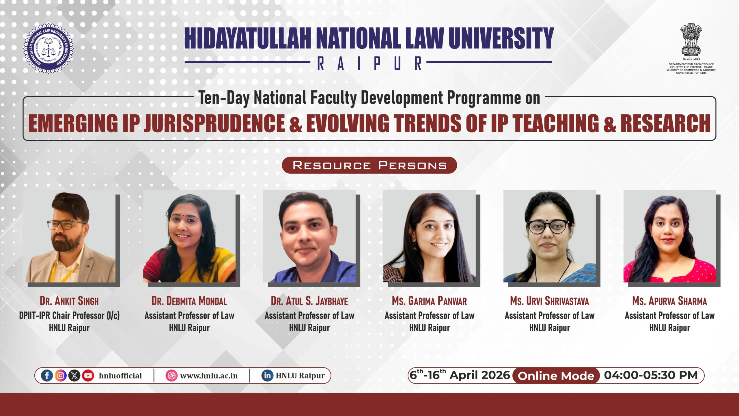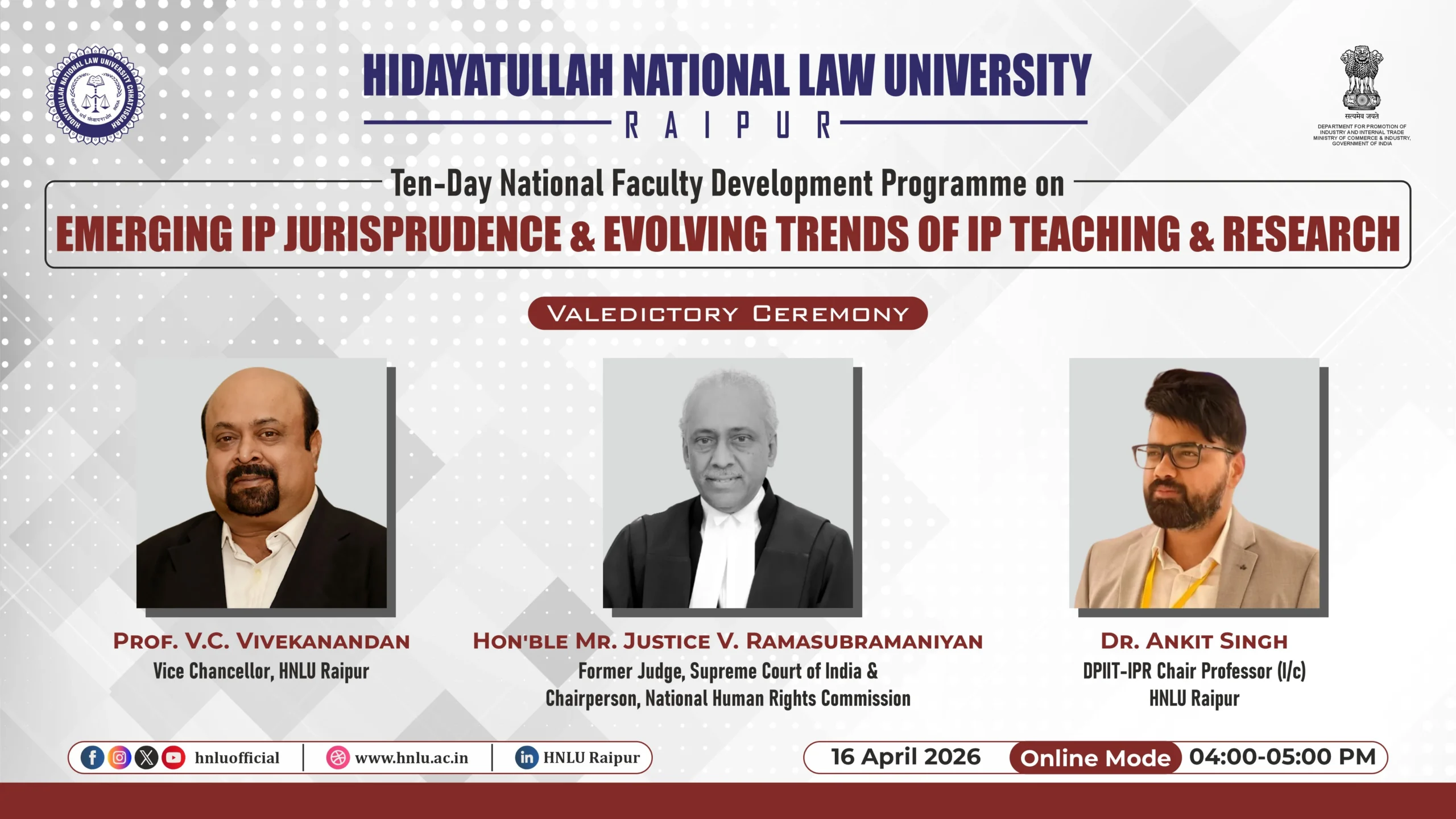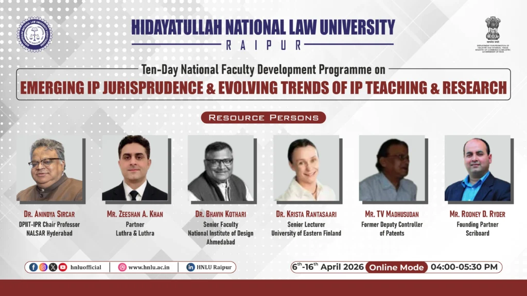 Hidayatullah National Law University (HNLU), Raipur, successfully organised a Ten-Day National Faculty Development Programme (FDP) on “Emerging IP Jurisprudence and Evolving Trends of IP Teaching & Research. 2026” The programme concluded with an insightful valedictory session addressing the future of intellectual property law in India.